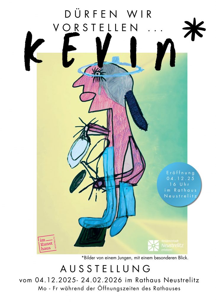 Die Ausstellung „Kevin – Linien einer eigenen Welt“ wird am 4. Dezember im Rathaus Neustrelitz eröffnet und ist bis Februar 2026 zu sehen. Die Zeichnungen können im Rahmen der Ausstellung erworben werden.